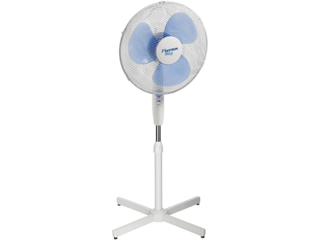 Der Ventilator Bestron AFT45SW ist ein weißer, tragbarer Ventilator mit den Maßen 65 x 130 x 65 cm und einem Gewicht von 3 kg. Er bietet eine Leistung von 40 Watt und wird über das Stromnetz betrieben. Er ist mit einer Bedienungsanleitung ausgestattet und benötigt keine Batterien.