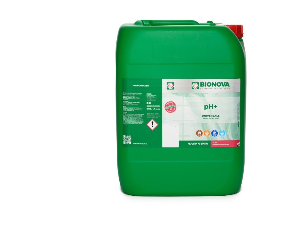Bionova pH+ ist eine Lösung von Kaliumhydroxid, die 24,5% enthält. Es ist sehr wichtig, den pH-Wert des Wassers/Nährstofflösung, die Sie den Pflanzen zuführen, richtig zu steuern. Pflanzen nehmen alle Nährstoffe nur richtig auf, wenn der pH-Wert stimmt. Wenn der pH-Wert zu niedrig oder zu hoch ist, kann die Pflanze nicht alle notwendigen Nährstoffe richtig aufnehmen.