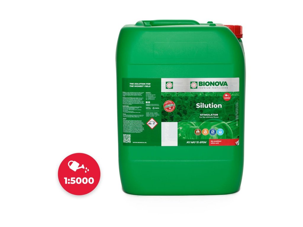 Silution sollte von der ersten Wachstumswoche bis zur letzten Blühwoche verwendet werden. Fügen Sie zuerst Wasser in den Tank, dann die richtige Menge an Silution und rühren Sie gründlich um. Fügen Sie dann die üblichen Mengen an anderen Düngemitteln und Stimulatoren hinzu und rühren Sie wieder gut um. Silution kann in Kombination mit allen Düngemitteln, Stimulatoren, Mineralstoffen, Universal-Düngemitteln und Bionova-Substraten verwendet werden. Es kann sowohl für die Bewässerung als auch für den Blattspray verwendet werden.