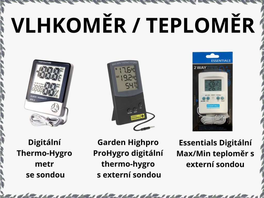 Verwendete Produkte: Digitaler Thermo-Hygronometer mit Sonde, Garden Highpro ProHygro Digitaler Thermo-Hygrometer mit externer Sonde, Essentials Digital Max/Min Thermometer mit externer SondeWenn Sie Fragen zur Konfiguration Ihres Anbauzeltes haben, zögern Sie nicht, uns per E-Mail unter info@ledmegrow.cz zu kontaktieren.