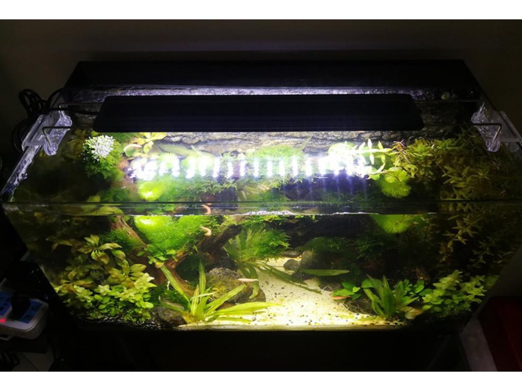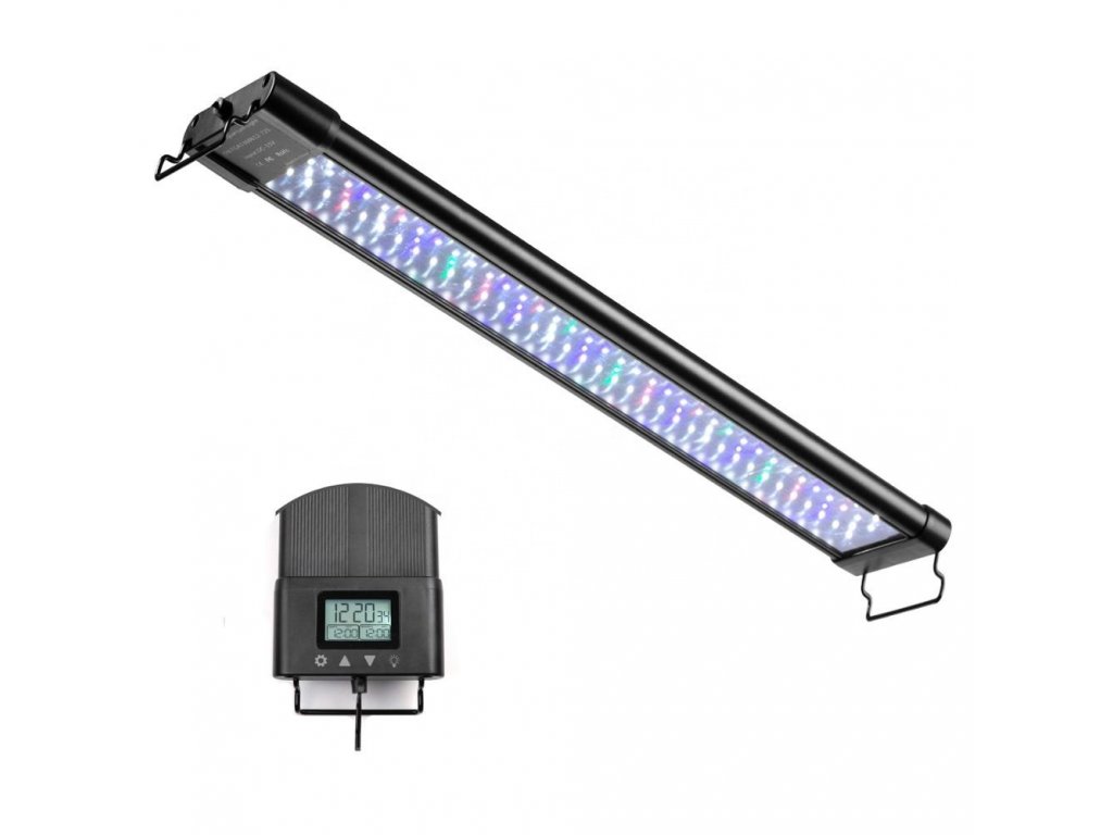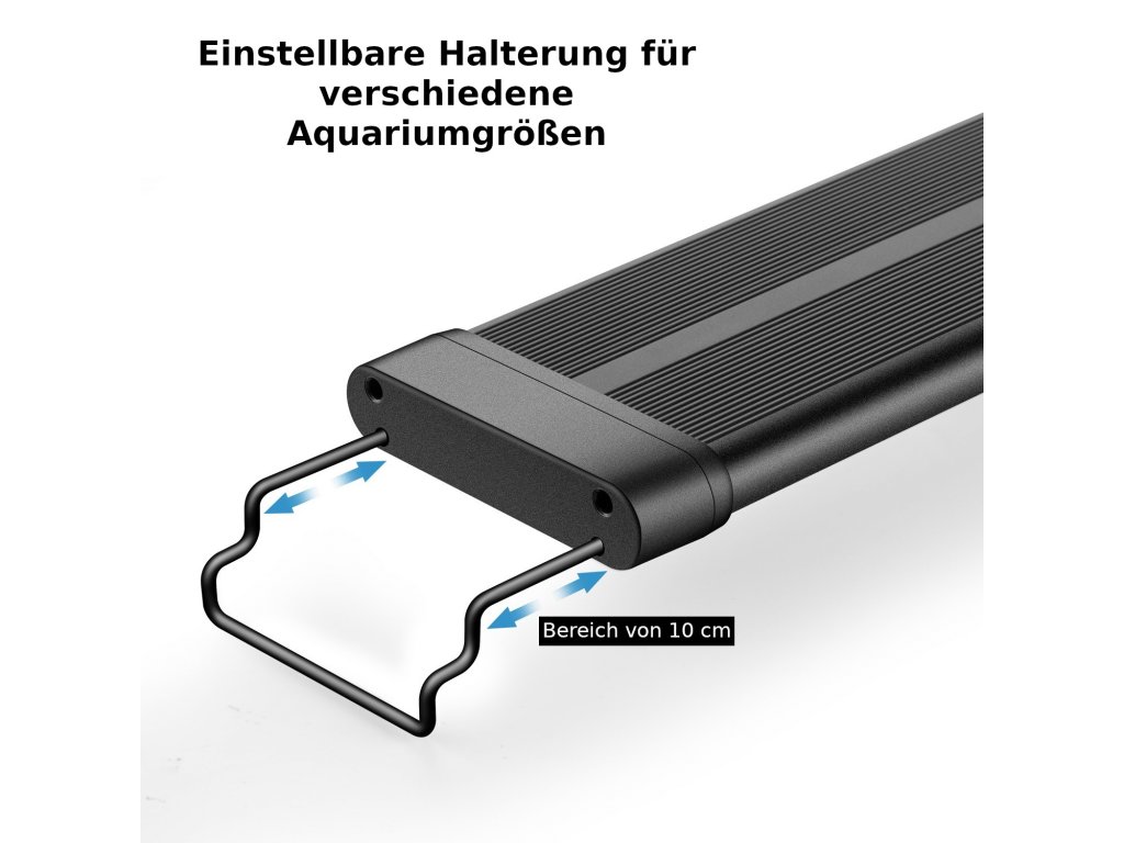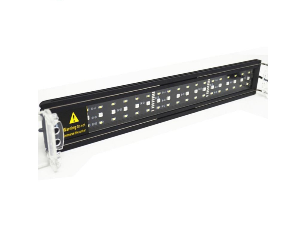 Dies ist eine hochwertige Aquarienleuchte mit einer Gesamtleistung von 30W, die absolut alles hat, was Sie für die Beleuchtung Ihres Aquariums benötigen. Sie verfügt über eine programmierbare Einheit, die es Ihnen ermöglicht, die Intensität natürlich zu dimmen, um Sonnenaufgang und Sonnenuntergang zu simulieren, was den Stress für Fauna und Flora reduziert. Ein weiterer unbestreitbarer Vorteil ist die Flexibilität der Leuchte selbst. Das ist bei der Installation sehr praktisch, denn auf jeder Seite der Leuchte befindet sich eine verschiebbare Halterung, die Sie an den Aquarienwänden befestigen können. So können Sie die Größe um bis zu 10 cm auf jeder Seite verstellen.