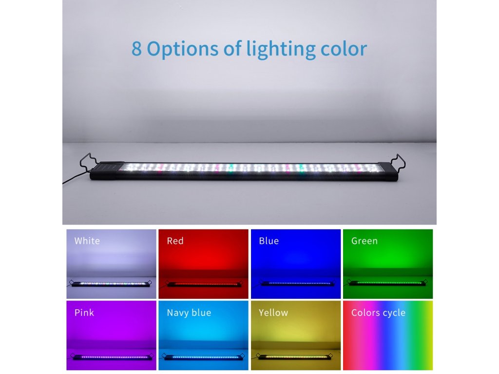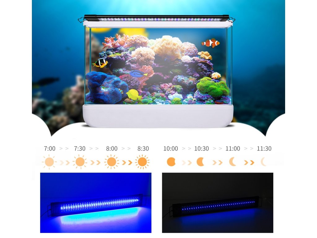 Programmierbare LED-Aquarienbeleuchtung 30W mit Dimmfunktion. Einstellbare Größe 60cm, damit sie genau zu Ihrem Aquarium passt. Einfache Befestigung der Leuchte an den Seitenwänden des Aquariums.