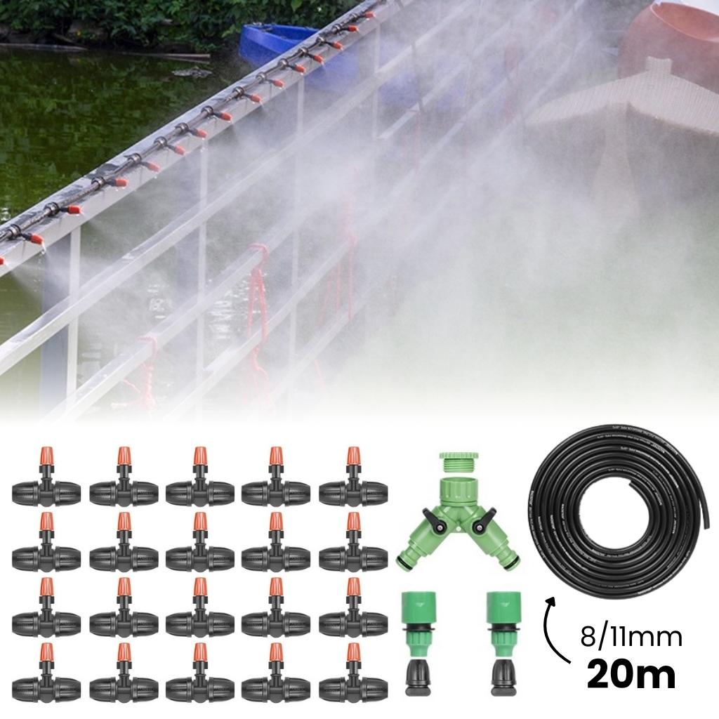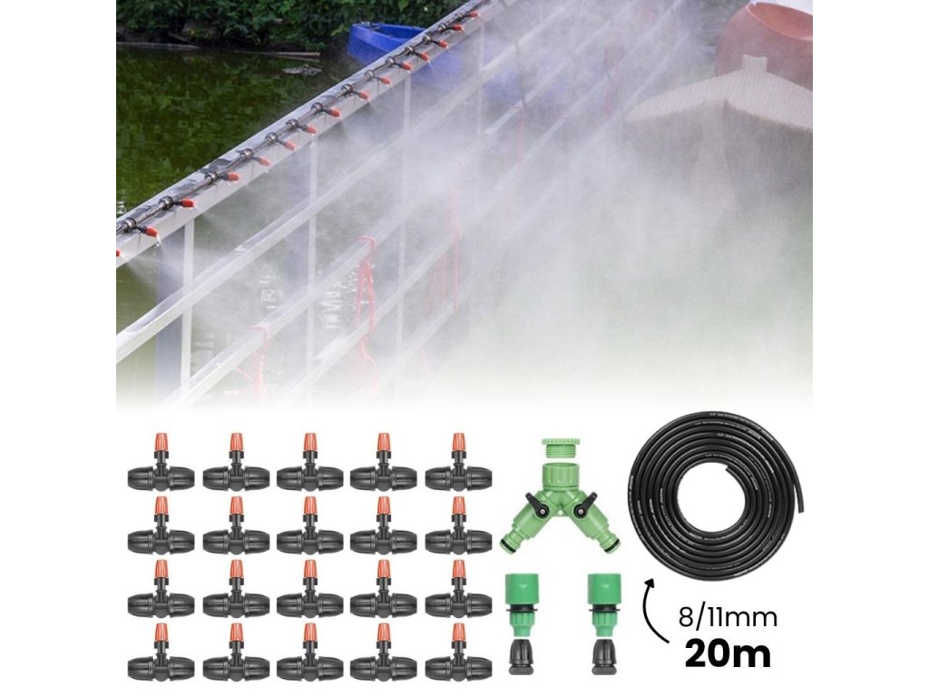Bewässerungssystem für Gewächshäuser und Blattpflanzen mit einfacher Installation. Das Paket enthält alle Komponenten für einen einfachen Anschluss des Bewässerungssystems. Mit 20 Metern festem Schlauch mit einem Durchmesser von 8/11 können Sie ein Gewächshaus von 10-12 Metern problemlos bewässern. Wenn Sie ein kleineres Gewächshaus haben, können Sie dieses Set verwenden, um beide bepflanzten Seiten des Gewächshauses zu bewässern.