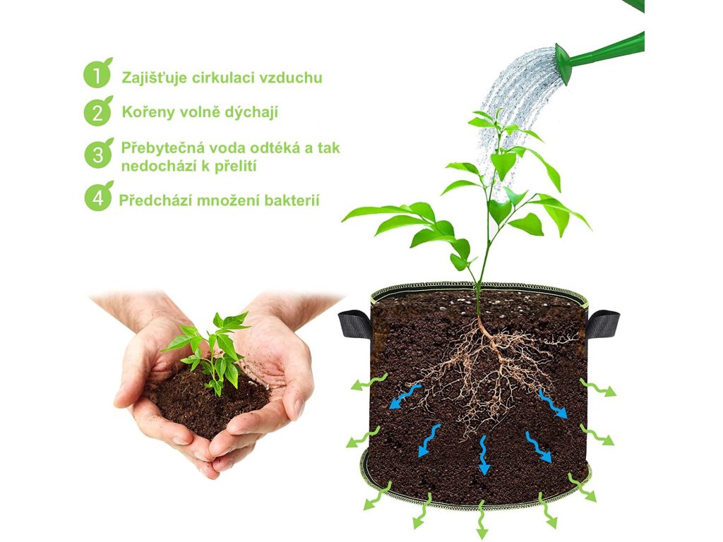 Recyclebarer Textil-Blumentopf mit Henkeln. Kann sowohl für das indoor als auch für das outdoor Anbauen verwendet werden. Er leitet Wasser hervorragend ab und Ihre Pflanze wird somit qualitativ hochwertige Wurzeln haben. Nach dem Einpflanzen in den Boden findet eine allmähliche Zersetzung statt.