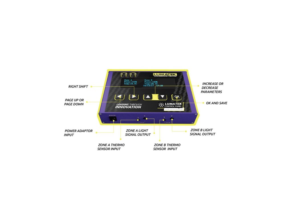 Das Lumatek Control Panel ist ein digitaler Lichtregler, der absolute Kontrolle über Ihre Lumatek Vorschaltgeräte und Ihre Beleuchtung bietet. Mit seiner hochinnovativen Technologie überwacht dieser Regler intelligent die Raumtemperatur, die Lichtzeitsteuerung, die Automatisierung, die Sicherheitskontrolle und die Dimmung. Verbinden Sie ihn einfach mit den Lumatek Controllable Vorschaltgeräten und passen Sie das Umfeld in Ihrem Anbauraum an.