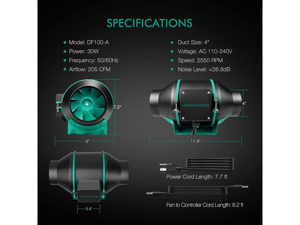 Der Mars Hydro Ventilator sorgt für eine effiziente Luftzirkulation, während der Kohlenstofffilter das Entweichen von Gerüchen verhindert und so ein gesundes Umfeld für Ihre Pflanzen schafft.