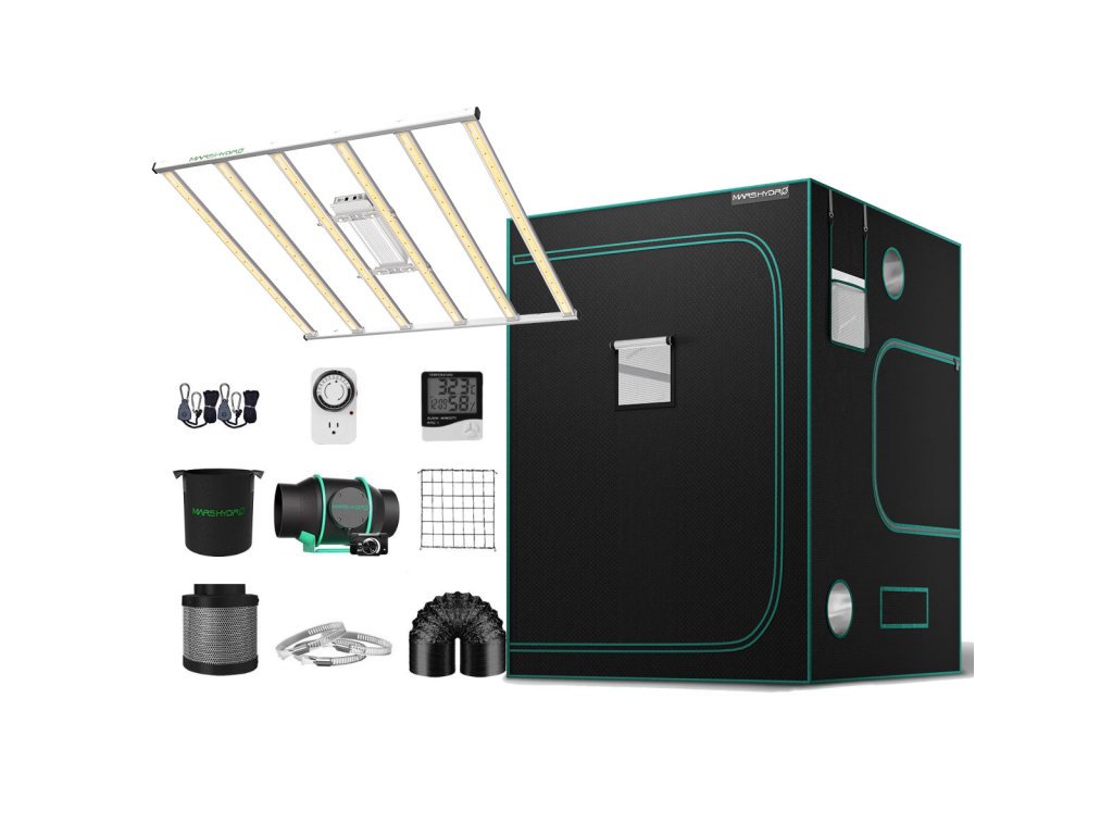 LED Grow Lights FC-E6500, ein 150cm x 150cm x 200cm großes Grow-Zelt, einen Ventilator mit 500m3/h Luftdurchsatz, einen Kohlefilter, einen Clip-On-Ventilator mit 15cm Durchmesser und andere nützliche Anbauwerkzeuge.