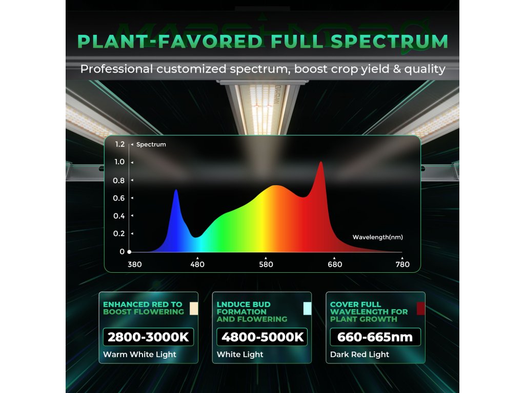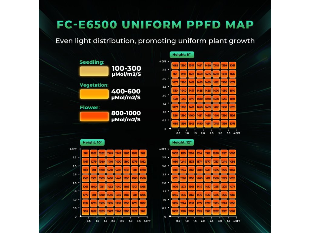 Das Modell FC-E6500 von Mars Hydro mit BridgeLux-LEDs liefert eine Spitzeneffizienz von 2,8 µmol/J PPE, mit einem maximalen Ertrag von 2,5 g pro Watt und einer Leistungsaufnahme von 730 W. Das kompaktere Design sorgt für eine bessere Erntequalität und ist gleichzeitig sparsamer.