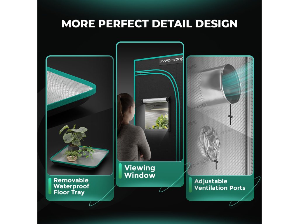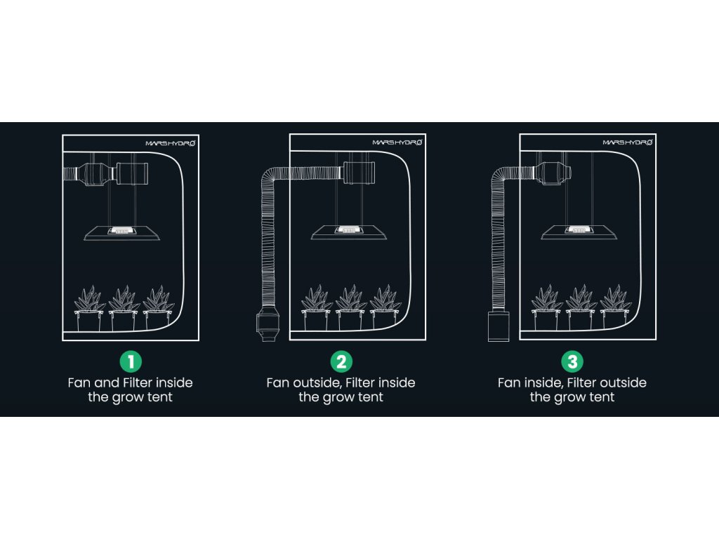 Die Mars Hydro Anbauschränke sind langlebig, tragbar und verfügen über reflektierende Materialien für die maximale Lichtnutzung. Sie ermöglichen eine optimale Kontrolle von Temperatur, Licht und Luftfeuchtigkeit für gesundes Pflanzenwachstum. - Belüftungssystem
