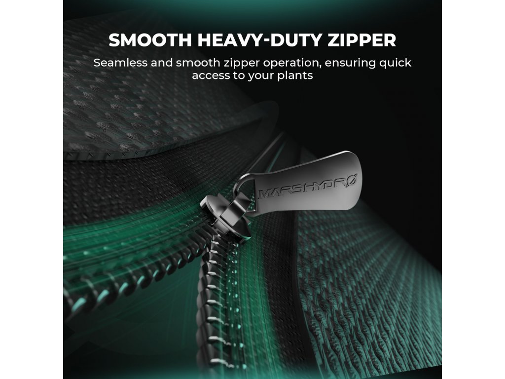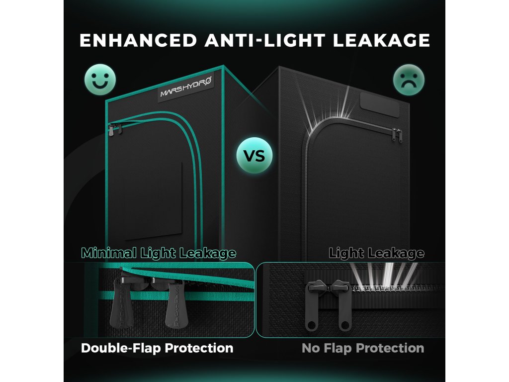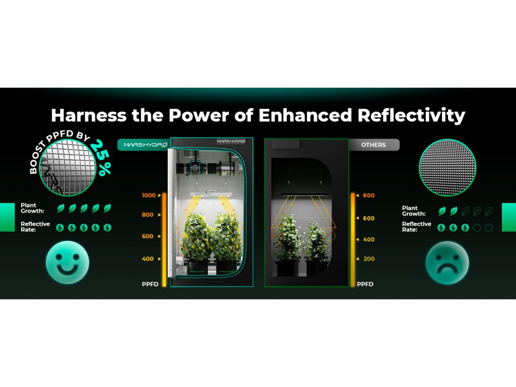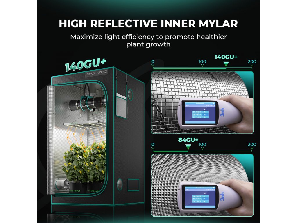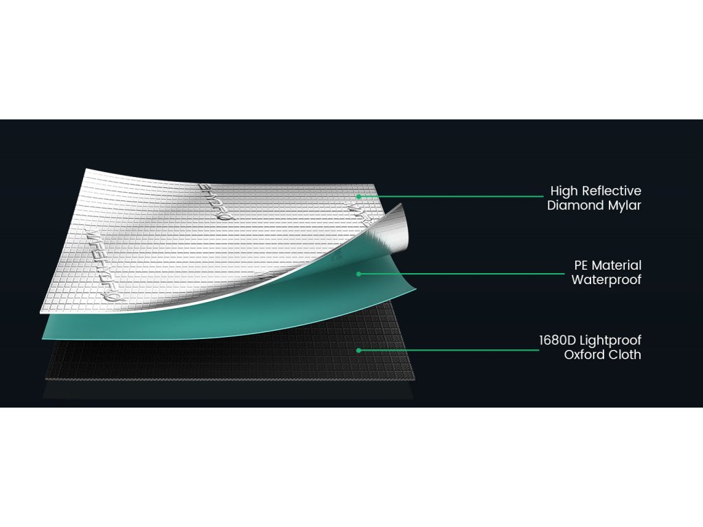 Das Innere des Zuchtzeltes von Mars Hydro zeichnet sich durch eine hohe Reflektivität dank der Verwendung von Diamantmylar-Material aus. Ein spezielles Schattierungsgewebe zwischen dem Reißverschluss und der Plane verhindert jeglichen Lichteinfall. Das doppelt genähte 1680D dichte Segeltuch sorgt für perfekten Lichtschutz im Inneren und ist reißfest.