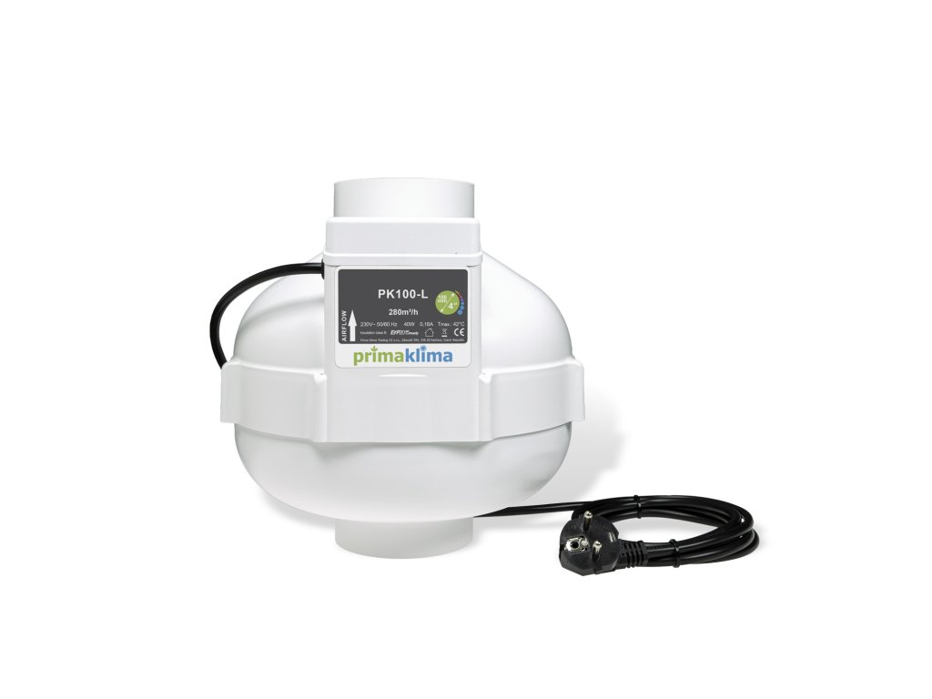 Primaklima PK100-L ist ein hocheffizienter Rohrventilator ausgestattet mit einem AC-Motor von ebm-papst mit rückwärts gekrümmten Schaufeln, der optimal an das Gehäusedesign angepasst wurde. Das gesamte Gehäuse ist aus hochfestem, flammhemmendem Polyamid (Nylon) gefertigt. Wartungsfreie, langlebige Kugellager tragen zu einem besonders leisen Motorlauf bei.