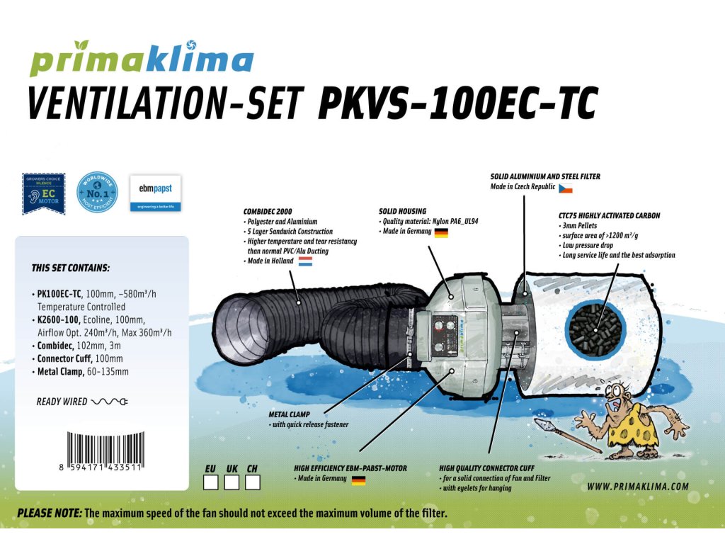 Das Prima Klima PKVS-100EC-TC Set kombiniert einen hochwirksamen Filter und Ventilator in einer komplett funktionalen Lösung. Es beinhaltet einen aktiven Karbonfilter K2600-100, ein flexibler 102mm Luftschlauch und eine Metallklemme mit einem Schnellverschluss-Mechanismus. Das Set enthält zudem eine hochqualitative Kupplung zur festen Verbindung von Ventilator und Filter. Der Ventilator PK100EC-TC wird temperaturgesteuert und sorgt für einen leisen und effizienten Luftstrom. Dieses Set ist ideal für eine effiziente und leise Luftfilterung.
