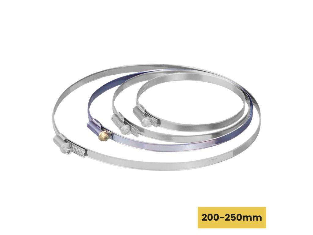 Spannbänder bieten eine einfache und zuverlässige Lösung zur Befestigung von Rohren der Größe 200–250 mm. Dank ihrer einfachen Anpassung an verschiedene Größen ermöglichen sie eine schnelle und feste Verbindung, die dort hält, wo sie benötigt wird. Sie sind kompatibel mit allen Arten von flexiblen Rohrleitungen und erleichtern die Installation und Wartung von Systemen.