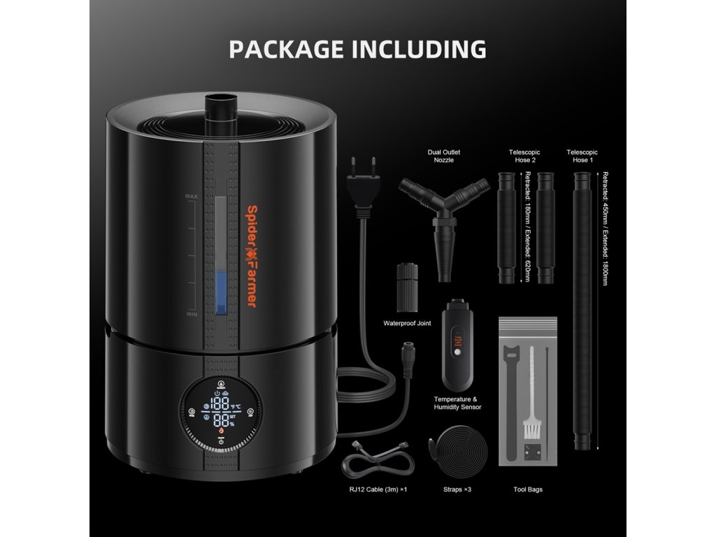 Der große Tank ermöglicht langanhaltende, kontinuierliche Befeuchtung mit ultraleisem Betrieb – ideal für Innenräume und Growzelte. - Verstellbare Düse mit Verlängerungsschlauch