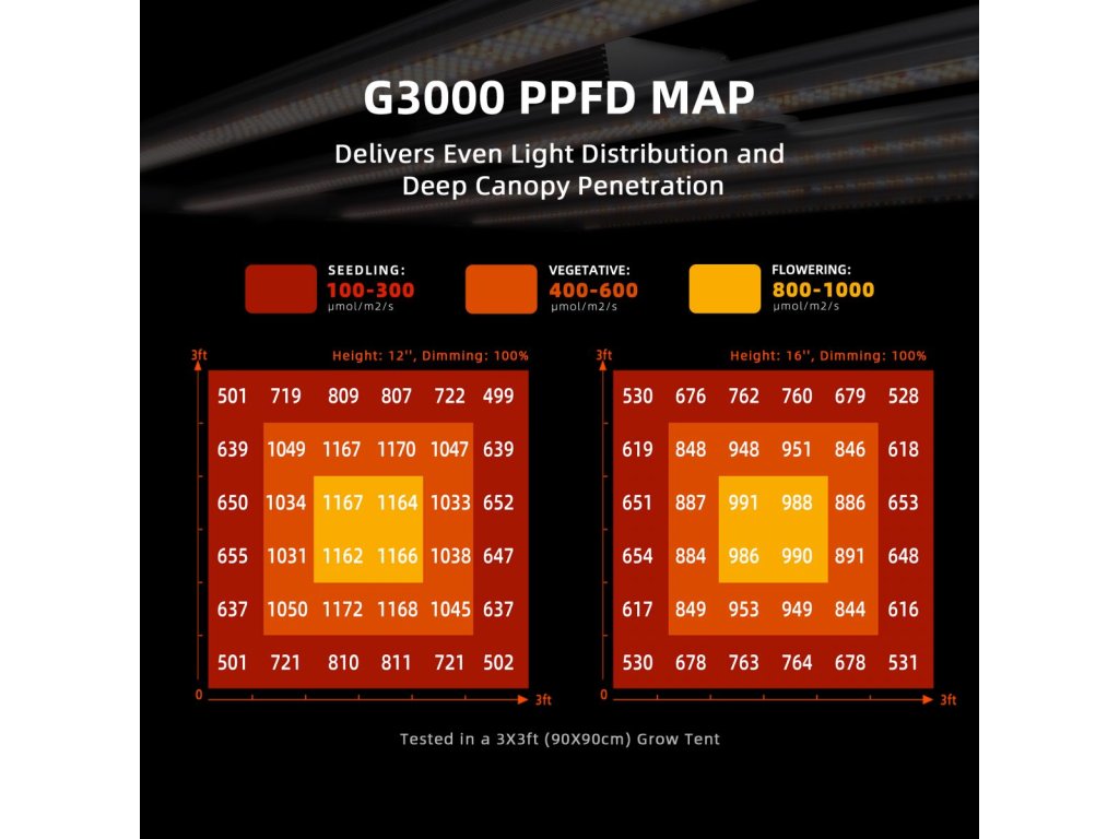 Die G-Reihe von Spider Farmer ist eine preiswerte und hocheffiziente Wahl für Züchter. Dieses LED Grow Panel der G3000 Serie bietet eine hohe Effizienz von 2,8 umol/J und eine maximale Leistung von 300W. Dank der Verwendung hochdichter LED-Dioden der amerikanischen Marke Bridgelux wird die Energie optimiert, was zu geringerer Wärmeerzeugung und exzellenter Leistung führt. Die Beleuchtung kann über eine App gesteuert werden, die die Simulation von Sonnenaufgang und -untergang sowie die Einstellung eigener Zeitpläne und Helligkeitsstufen ermöglicht. Die Lichtabdeckung beträgt 70x70 cm bis 90x90 cm, ideal für ein Anbauzelt mit einer Größe von 90x90 cm.