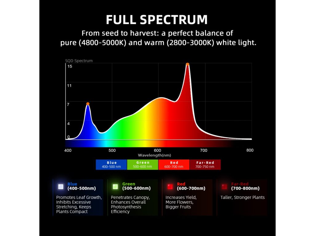 - Spektrum: 2800-3000K, 4800-5000K650-665nm, Far-Red (700-800nm)
