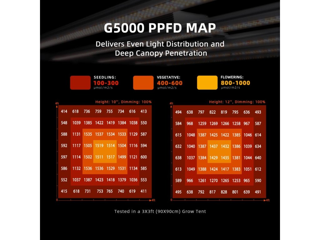 Die G-Reihe von Spider Farmer ist eine preisgünstige und hoch effiziente Wahl für Züchter. Diese LED Grow-Paneele der G5000-Serie bieten eine hohe Leistungseffizienz von 2,85 umol/J und eine maximale Leistung von 480W. Durch die Verwendung von hochdichten LED-Dioden der amerikanischen Marke Bridgelux wird die Energie optimiert, was zu einer geringeren Wärmeentwicklung und einer hervorragenden Leistung führt. Die Beleuchtung kann über eine App gesteuert werden, die die Simulation von Sonnenauf- und -untergang, sowie die Einstellung von individuellen Zeitplänen und Helligkeitsstufen ermöglicht. Die Lichtabdeckung beträgt 120×120 cm, was ideal für ein Anbauzelt mit den Maßen 120×120 cm ist.