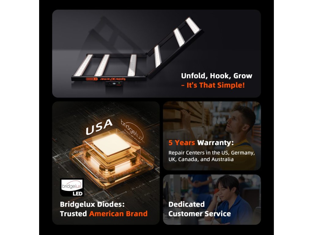 Spider Farmer verwendet LED-Dioden von Bridgelux, einer bekannten amerikanischen Marke mit mehr als 20 Jahren Erfahrung. Diese Technologie bietet hohe Effizienz und lange Lebensdauer, wobei die Züchter von stabiler Leistung auch nach mehr als 3 Jahren Gebrauch berichten.