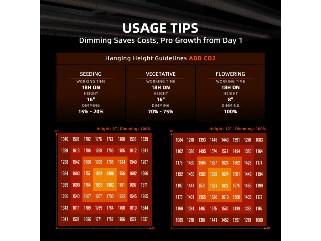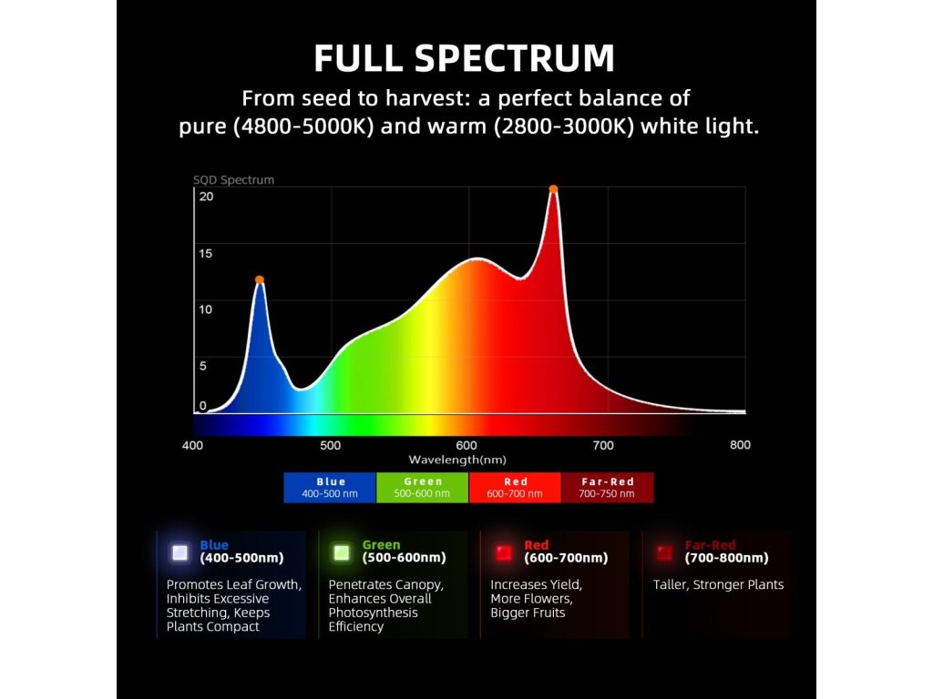 - Spektrum: 2900-3200K, 4700-5300K,650-665nm, Far-Red (700-800nm)