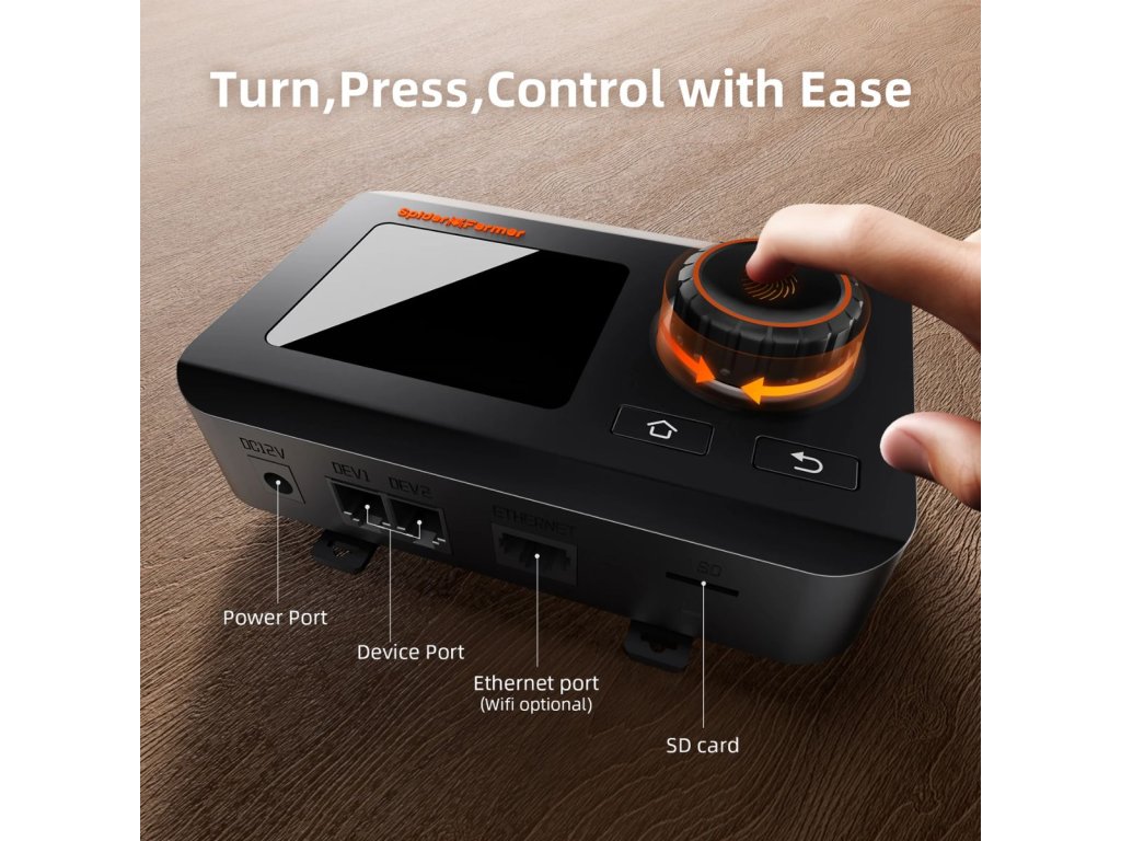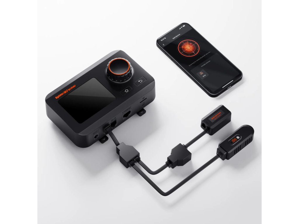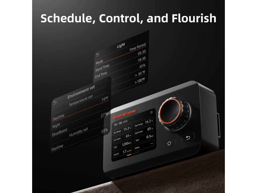 Der intelligente Spider Farmer GGS Controller für das Anbauumfeld ermöglicht die Automatisierung von Temperatur-, Luftfeuchtigkeits- und Lichtsteuerung in Ihrem Grow-Zelt. Er ist kompatibel mit den Wachstumsleuchten der SF-, G- und SE-Serie und Lüftern mit einem RJ12-Port. Mit der Spider Farmer App können Sie das Gerät aus der Ferne steuern, Zeitpläne einstellen, die Helligkeit anpassen und den Übergang zwischen Sonnenaufgang und Sonnenuntergang simulieren.