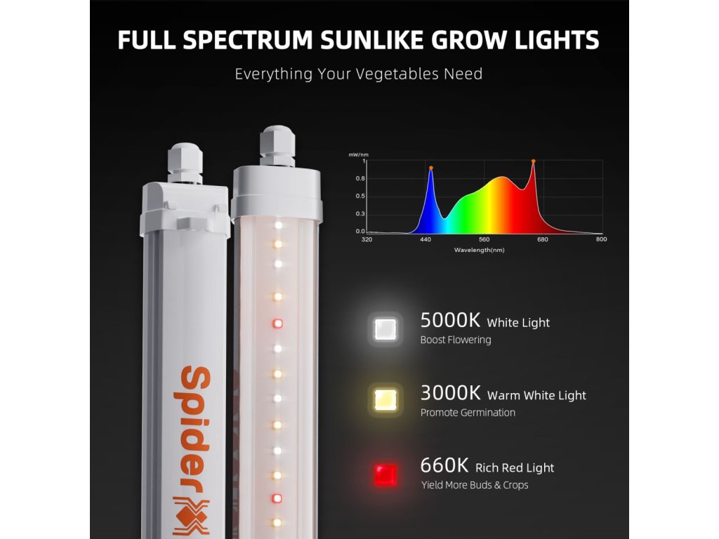 Vollspektrumbeleuchtung Glow30 verwendet Breitbandlicht in den Bereichen 5000-5500 K (kaltweiß), 3000-3500 K (warmweiß) und 650-660 nm (rot). Diese Mischung bietet das ideale Spektrum, um die Photosynthese und ein gesundes Pflanzenwachstum in allen Phasen zu fördern. -