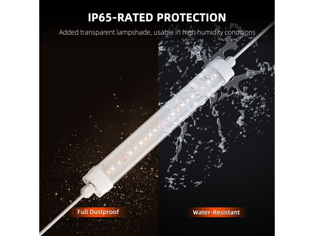 Wasserdichte Abdeckungen nach IP65 Jede Leiste ist mit einer hochwertigen, hitzebeständigen Abdeckung aus Polycarbonat (PC) versehen, um sie vor Feuchtigkeit, Wasser und Staub zu schützen. Sie sind leicht zu reinigen und verlängern die Lebensdauer der LEDs erheblich, was sie ideal für den Anbau in Umgebungen mit hoher Luftfeuchtigkeit macht. -
