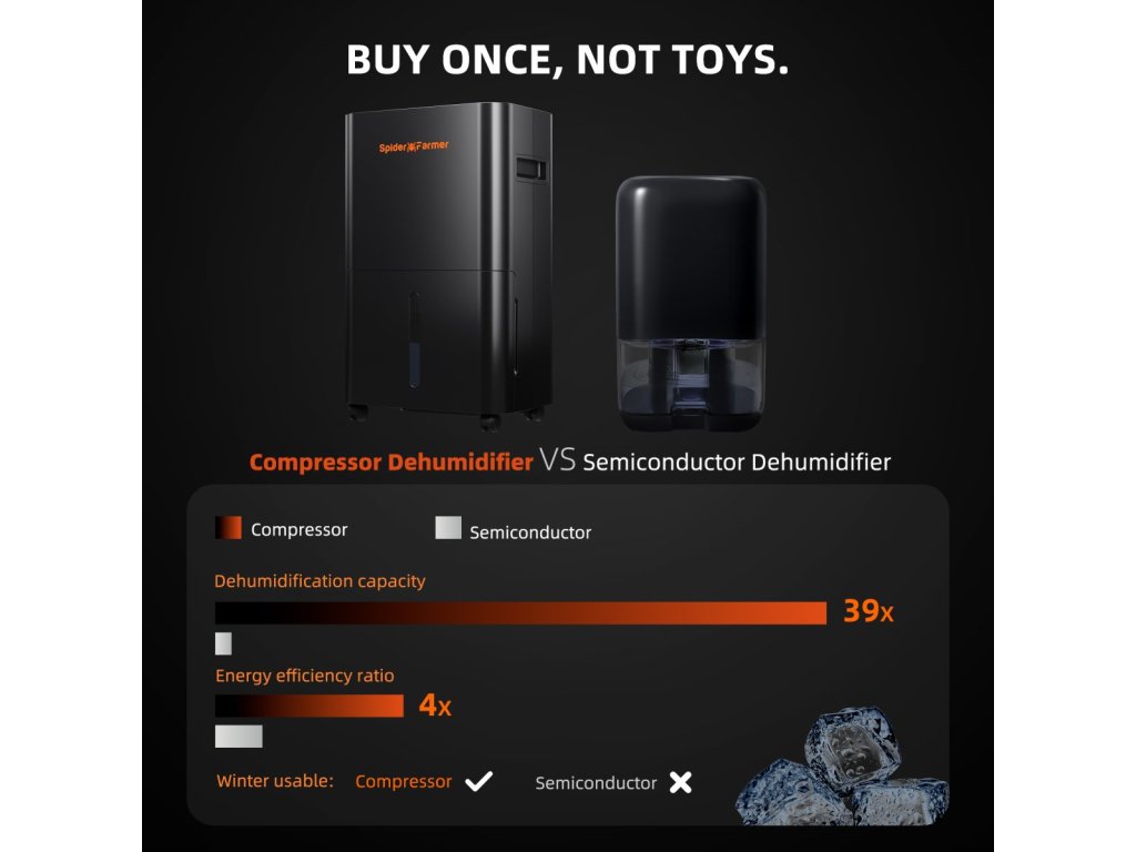 Spider Farmer Luftentfeuchter – 32 Pint für konstante LuftfeuchtigkeitWarum den Spider Farmer Kompressor-Luftentfeuchter wählen?Im Vergleich zu günstigen Halbleiter-Luftentfeuchtern, die besonders bei kalten Temperaturen ineffizient sind, bietet unser Kompressor-Modell eine deutlich bessere Leistung. Es entfernt Feuchtigkeit bis zu 39 Mal schneller, spart dadurch Zeit und senkt den Stromverbrauch – ideal für alle, die eine zuverlässige und effektive Lösung suchen. |