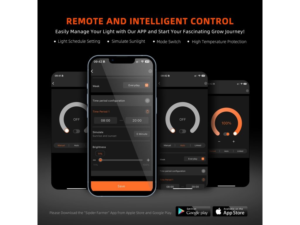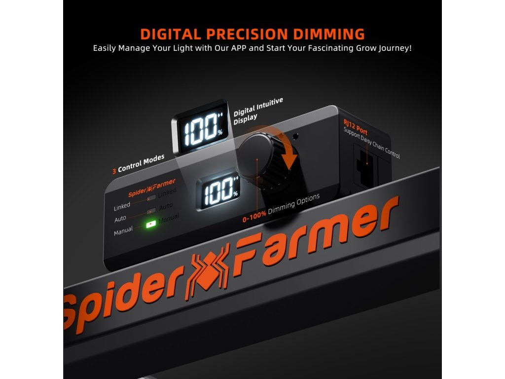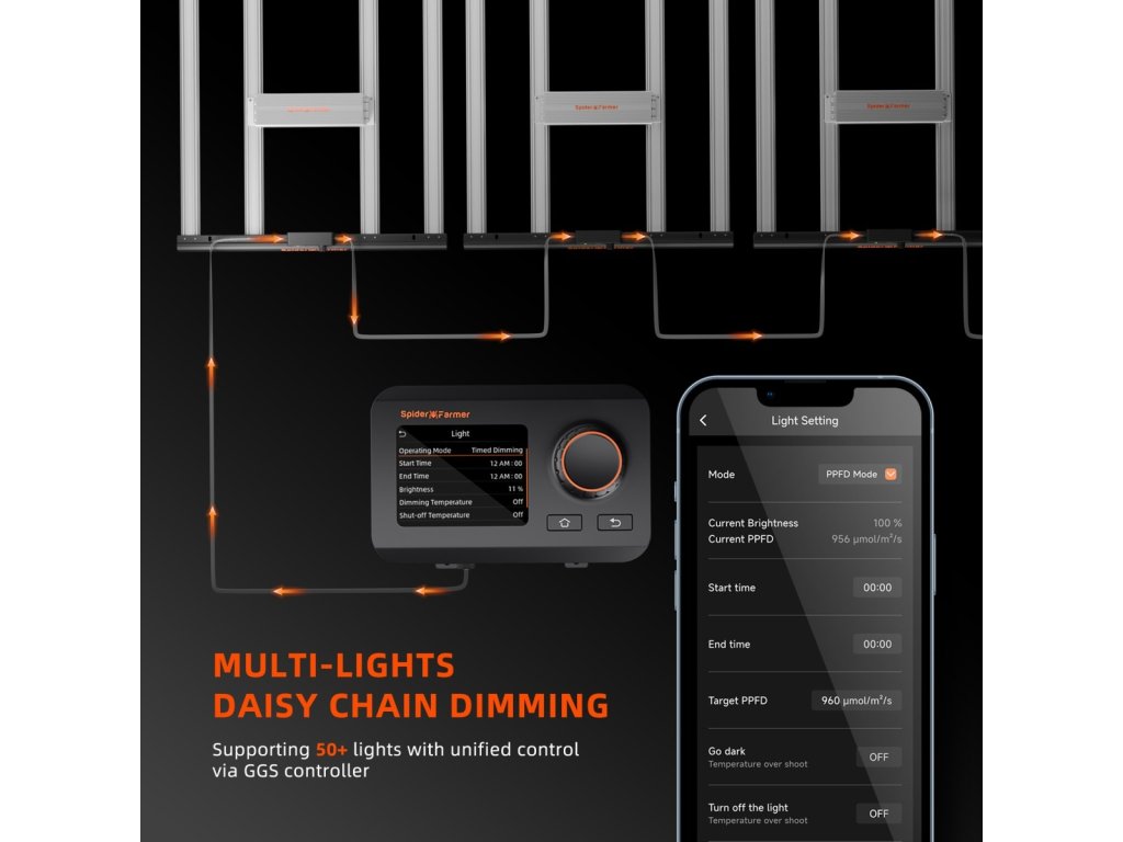 Mit dem Dimmknopf können Sie die Lichtintensität leicht anpassen. Die Daisy Chain Funktion ermöglicht die Verbindung und Steuerung von bis zu 50 Lampen gleichzeitig – ideal für größere Grow Rooms oder professionelle Gewächshäuser.