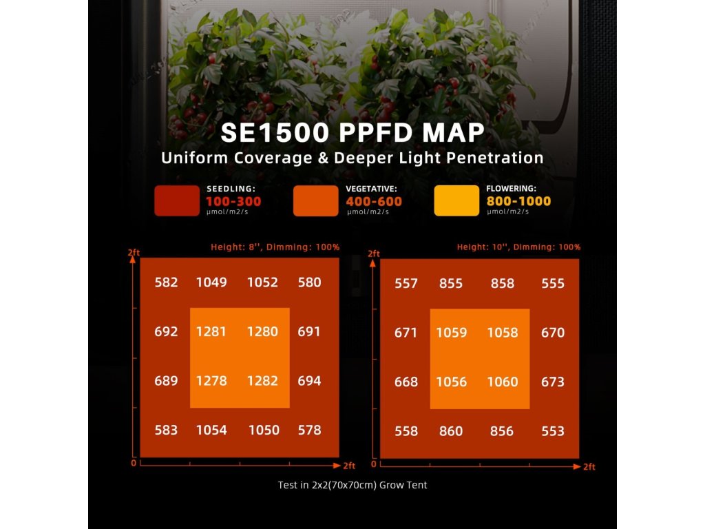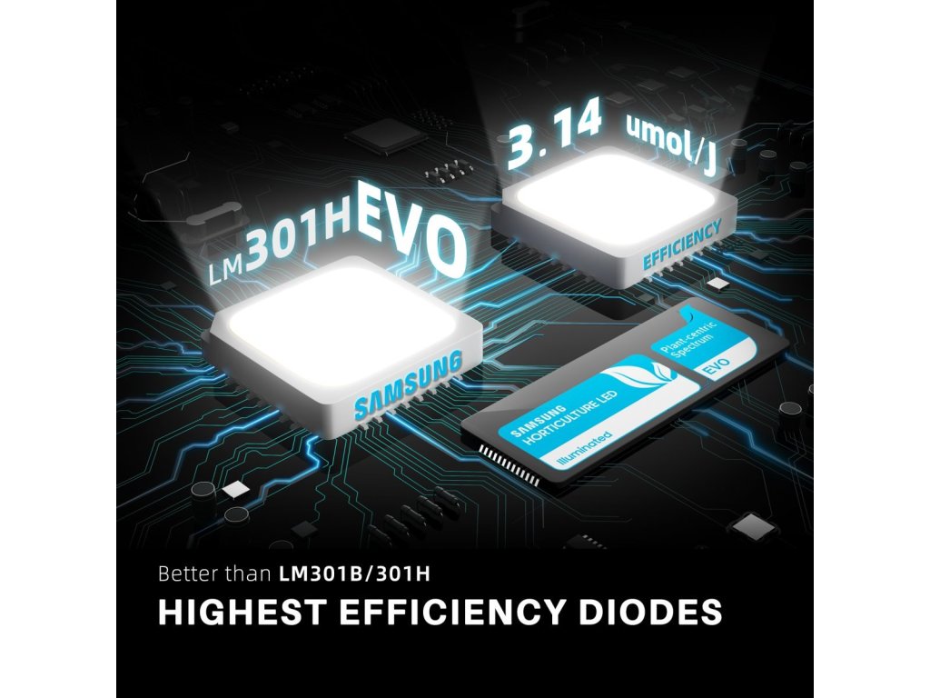 Mit einem Stromverbrauch von nur 150W ist sie eine energiesparende Alternative zu herkömmlichen HPS- oder MH-Lampen. Moderne Dioden von Samsung sorgen für eine höhere Lichtleistung pro Watt – das bedeutet niedrigere Stromrechnungen ohne Kompromisse bei den Ergebnissen. - Hoher fotosynthetischer Leistung (PPE 2,85 umol/J)
