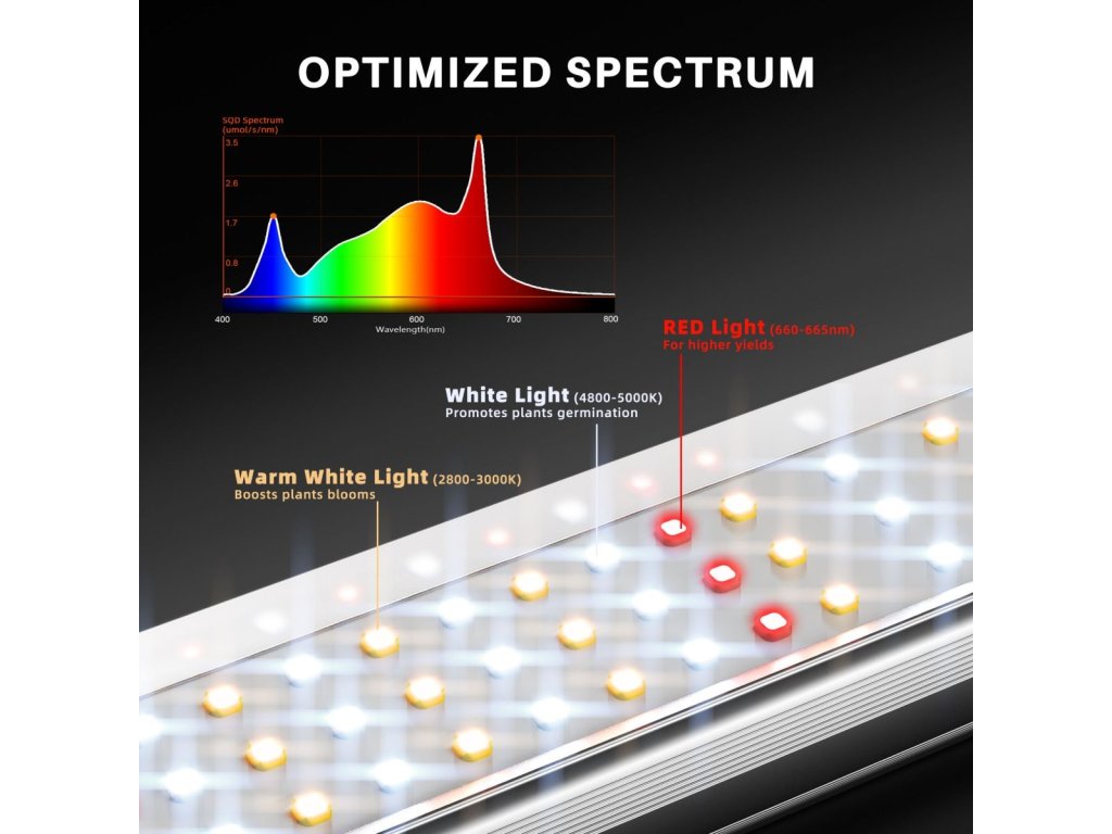 Die Konstruktion mit Aluminiumkühlung und offenem Design ermöglicht eine effiziente Luftströmung und reduziert den Bedarf an externer Kühlung. Durch die geringe Wärmeerzeugung kann die Lampe näher an den Pflanzen platziert werden, ohne die Gefahr von Verbrennungen. - Optimiertes Lichtspektrum