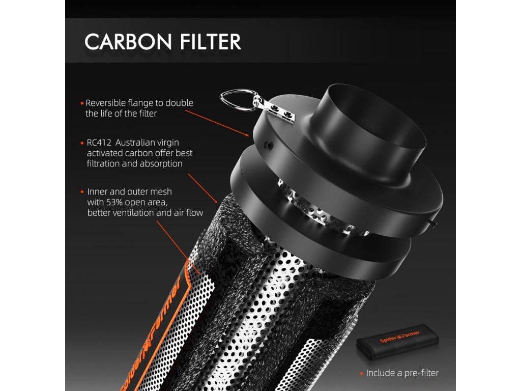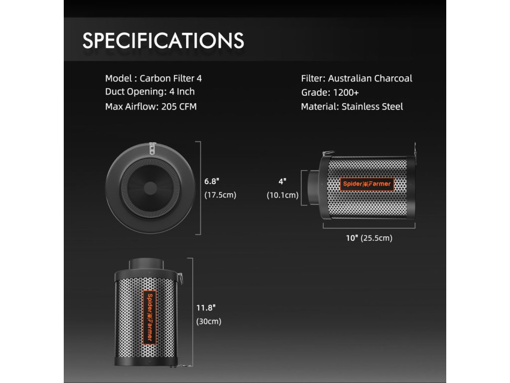 1 × 4" Ventilator, 1 × 4" Kohlefilter, 1 × flexibler Aluminium-Luftschlauch, 3 × Schlauchschellen. Der Kohlefilter hilft, Gerüche zu beseitigen, und der Ventilator sorgt für optimalen Luftaustausch.