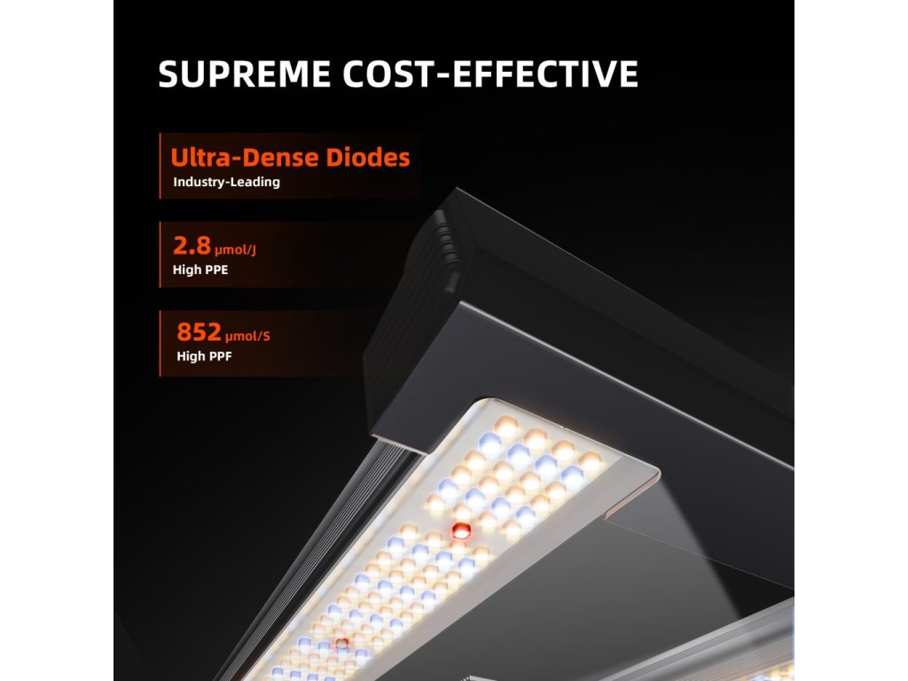1 × G3000 300W Full Spectrum LED Grow Light: Dieses LED-Grow-Licht ist die neueste Version für 2024 und ist mit Dioden der amerikanischen Marke Bridgelux ausgestattet. Die G-Serie verfügt über die höchste Dichte von LEDs in unserem Sortiment, was eine hervorragende Lichtdurchdringung und gleichmäßige Abdeckung gewährleistet. Eine höhere LED-Dichte bedeutet auch eine geringere Erwärmung und einen effizienteren Betrieb, so dass Sie bessere Ergebnisse bei geringerem Energieverbrauch erzielen können.