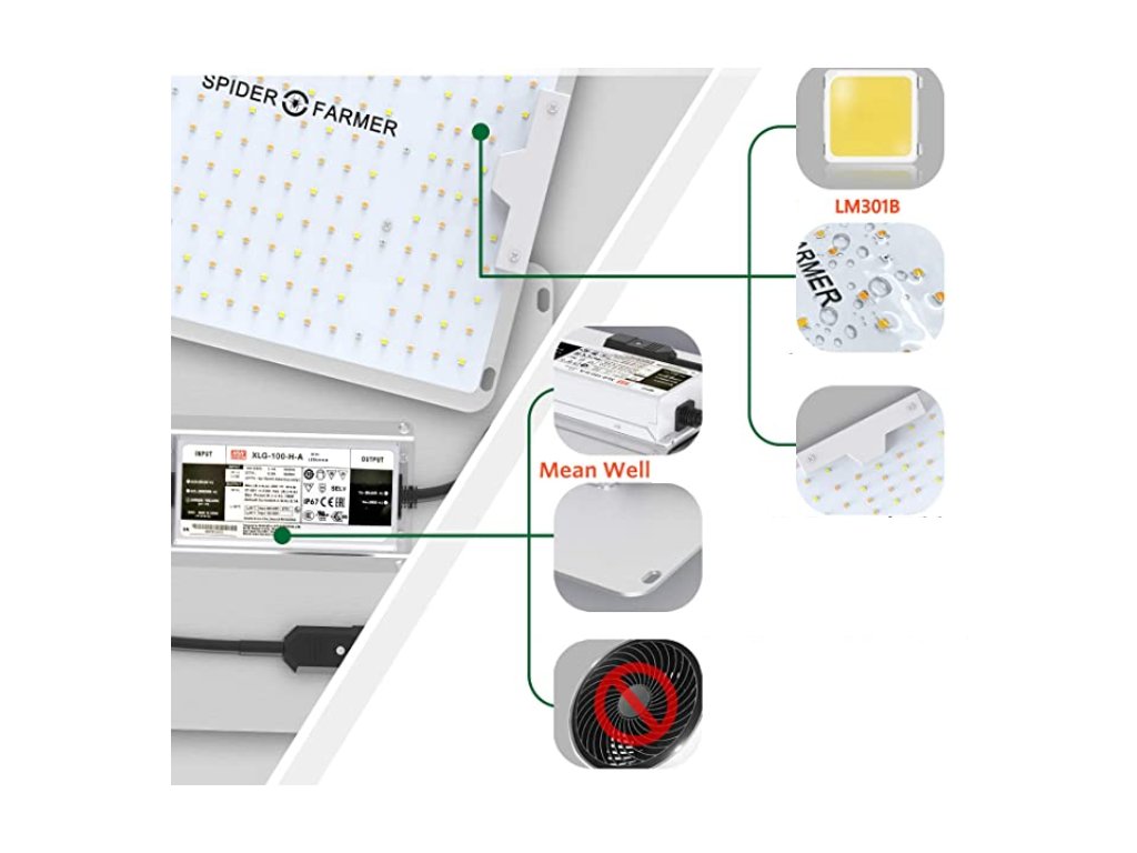 Der Hersteller Spiderfarmer verwendet nur die besten Komponenten wie Samsung LEDs und Power Meanwell Quellen. Diese haben ein bis zu 50% längeres Leben als herkömmliche Wachstumslichter.